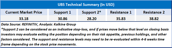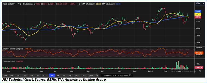 UBS is showing short-term weakness, trading below both its 21-day (USD 33.33) and 50-day (USD 33.59) moving averages. The RSI at 49.64 indicates neutral momentum, while increasing volume on recent down days suggests selling pressure. Support is around USD 30.00, with resistance near USD 36.00. A break above USD 35.53 could resume the uptrend, while dropping below USD 31.86 may signal further downside.