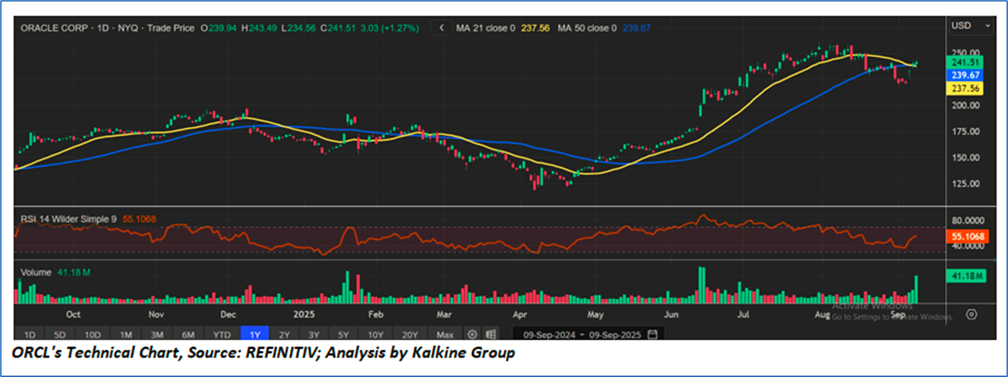 Oracle Corp.’s stock is consolidating after a strong rally earlier this year, currently holding above its 21-day and 50-day moving averages near USD 237–USD 239. The RSI at 55 signals neutral momentum, while a recent volume spike shows renewed buying interest. Overall, the trend remains constructive, with support around USD 235 and resistance near USD 245; a breakout above resistance could resume the uptrend, while a drop below support may invite further weakness.