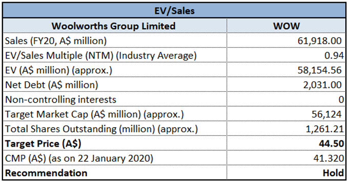 Stock Recommendation: As per ASX, the stock of WOW gave a return of 6.75% in the last 3 months and a return of 6.52% in the past one month. The stock made its new 52-week high of $41.320 on 22 January 2020 and managed to close at this level. During FY19, net margin of the company stood at 2.6%, slightly higher than the industry median of 2%. In the same time span, ROE of the company was 14.4% as compared to the industry median of 13.3%. Considering the returns, trading levels, higher ROE and decent outlook, we valued the stock using the EV/Sales valuation approach and arrived at a target upside of higher single-digit (in percentage terms). For the said purposes, we have considered Coles Group Ltd (ASX: COL), JB Hi-Fi Ltd (ASX: JBH) and Harvey Norman Holdings Ltd (ASX: HVN) as peers. Hence, we recommend a “Hold” rating on the stock at the current market price of $41.320, up by 3.274% on 22 January 2020.