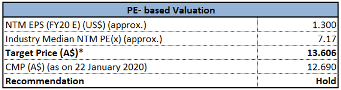 Stock Recommendation: As per ASX, the stock of FMG gave a return of 12.06% on the YTD basis and a return of 11.65% in the past one month. The stock is trading close to its 52-weeks’ high level of $12.810. During FY19, net margin of the company stood at 32%, higher than the industry median of 11% and ROE of the company was 31.4% as compared to the industry median of 12.3%. This indicates that the company is well deploying the capital of its shareholders and is able to generate profits internally. Considering the returns, trading levels, higher net margin and ROE and decent outlook, we valued the stock using Price/Earnings based valuation approach and arrived at a target upside of higher single-digit (in percentage terms). Hence, we recommend a “Hold” rating on the stock at the current market price of $12.690, up by 5.05% on 22 January 2020.
