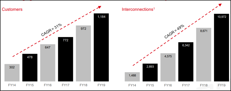 Strong Growth in Customers and Connectivity: Nextdc Limited (ASX: NXT) is engaged in the development and operation of independent data centres in Australia. During FY19, revenue of the company went up by 15% to $179.3 million and underlying EBITDA witnessed an increase of 13% to $85.1 million. The company also witnessed a CAGR of 31% in customers over the span of 5 years. The strong growth in connectivity drives average interconnects per customer to 9.3 in FY19 as compared to 8.9 in FY18. .png)